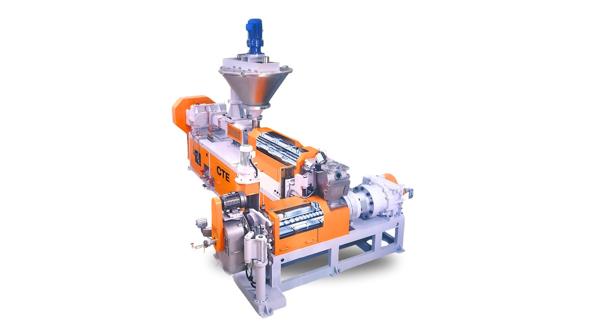 非噛合い異方向回転型の2軸押出機です。高濃度フィラーや低かさ比重材料において、優れた脱気性と分散性を発揮します。